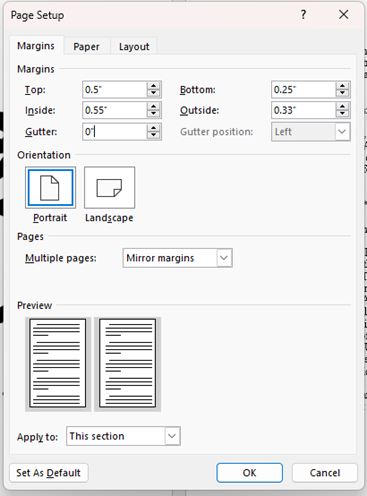 When formatting for a paperback (ebooks don’t care about margins) make sure you’ve got it set up correctly. The example below is for a 5×8 book with 315 pages. The inside margin should be more due to the gutter in the middle of the book. These dimensions make it fit Amazon’s KPD requirements exactly, so they might be different if you’re publishing with a different company. The top and bottom margins aren’t as stringent, but I don’t like taking too much space away from my story’s text. We’ll look at headers and footers later since those will determine your top and bottom margins.